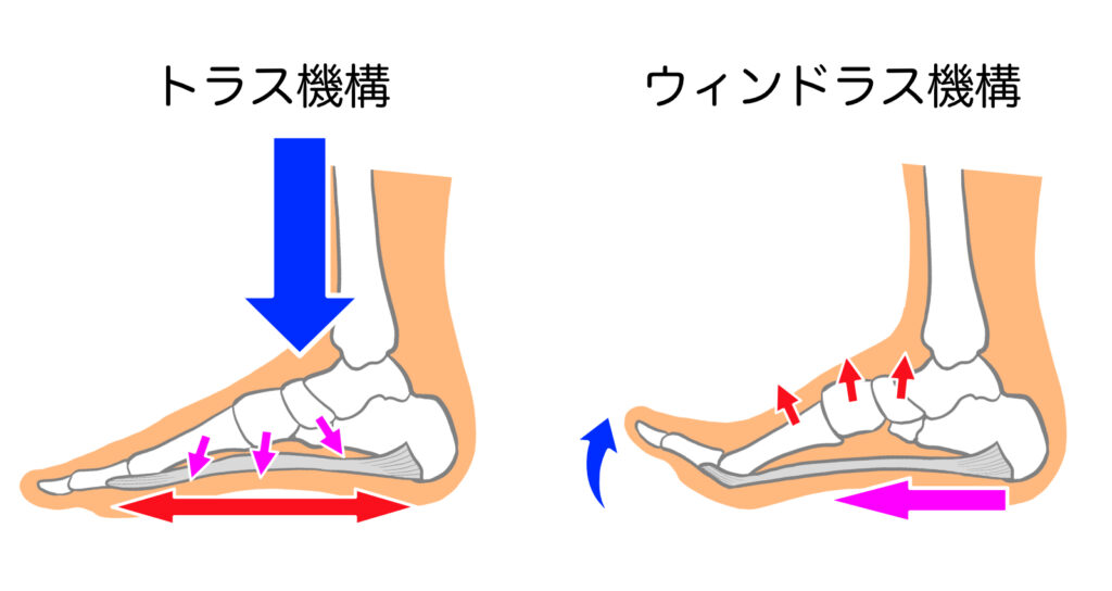 着地の瞬間、足のアーチが沈み込む際に、足底腱膜が引っ張られ、地面からの衝撃をゴムのように吸収・分散します。